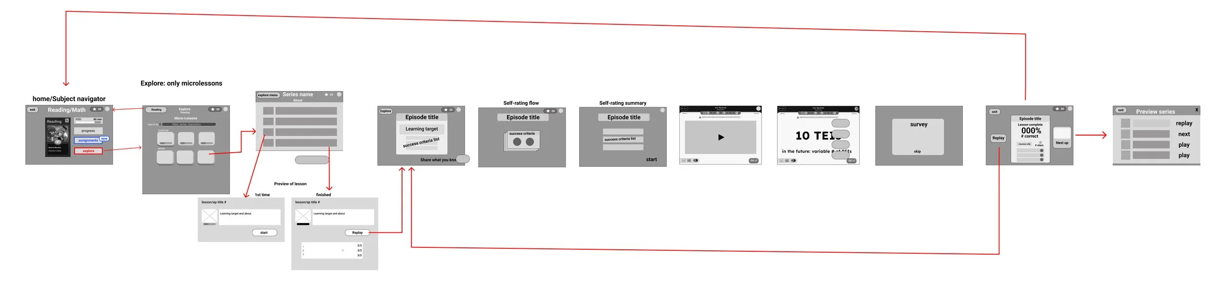 This shows the flow of how a student would get to the explore menu from the subject navigator page, choosing a series, choosing an episode, seeing the preview screen, starting the lesson, going through the lesson, and ending at the series page again.