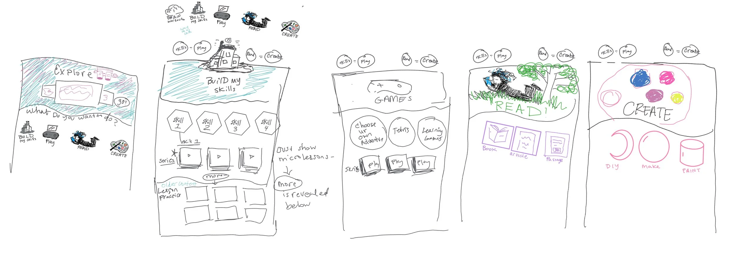 Explore menu potential sections: Build skills, play, read, create.